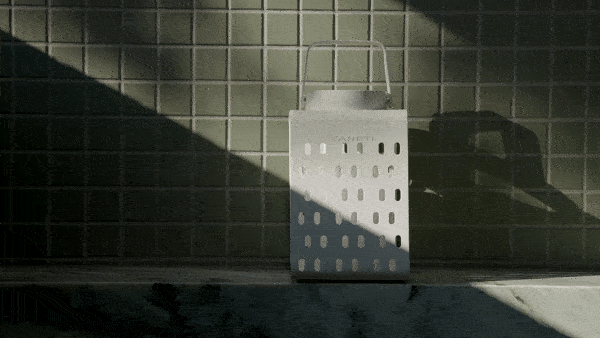 The extruded aluminium shell and handle ensure durability and a non-burdensome weight, which features a perforated pattern for softly dispersing light.